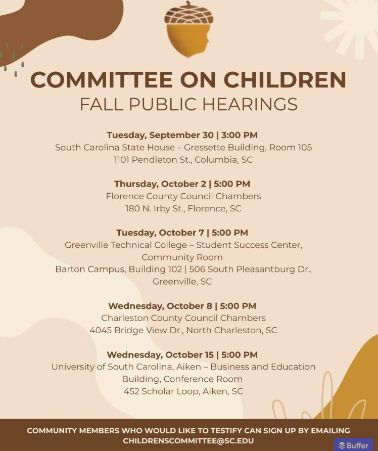 Join SC Tenant Union at the 2025 Fall Children's Committee Hearing in Charleston on October 8, 2025. We will meet at 4:30 pm at the Charleston County Council Chambers, and folks will have 3-4 minutes to tell folks on the committee what the community feels should be uplifted in the upcoming year to improve the lives of children across South Carolina.