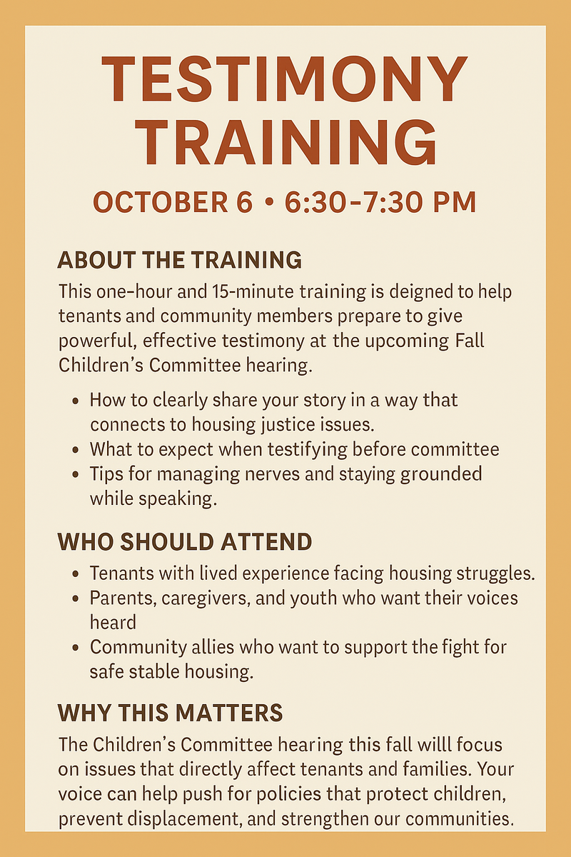 This one-hour training is designed to help tenants and community members prepare to give powerful, effective testimony at the upcoming Fall Children’s Committee hearing.